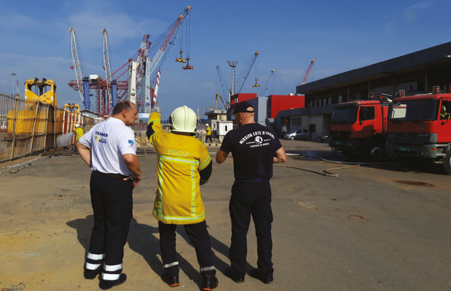 WeCAPS contribue à renforcer la sécurité et la sûreté des ports d’Afrique de l’Ouest et centrale. Ici, l’expert protection civile du projet avec un pompier togolais et un formateur de l’association BMPMonde dans le port de Lomé au Togo. © Marion Piccio